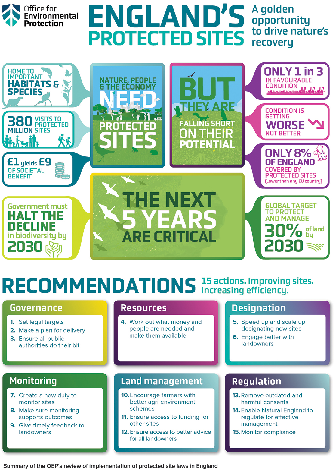 Concluding that the main barriers to effectiveness involve implementation rather than the legislation itself, the report makes 15 recommendations to Defra, Natural England and other public authorities, whilst also recognising that the achievement of positive environmental outcomes relies upon the actions of many private landowners and occupiers. The recommendations are across six themes: governance; resources; designation; monitoring, evaluation and reporting; land management incentives and advice; and regulatory tools and enforcement.